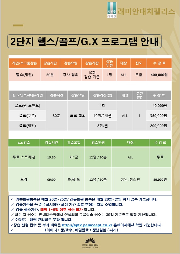 2단지 헬스/골프/GX 프로그램 안내 작성자 관리자 내용 프로그램 안내 입니다 첨부 파일 2.jpg [ Size : 132.9KB, Down : 430 ] 미리보기 다운로드 태그 조회수 328 작성일 2024년 11월 14일 9시 31분 48초 수정일 2024년 11월 14일 9시 34분 23초 추가정보 임시 정보가 없습니다. 목록보기